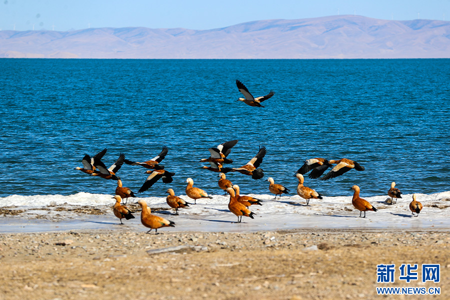 青海湖畔的赤麻鸭。新华网 鱼昊 摄